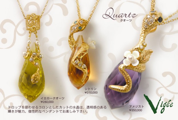 ヘビのペンダントのご紹介です。ドロップを思わせるコロンとしたカットの水晶は、透明感のある輝きが魅力。