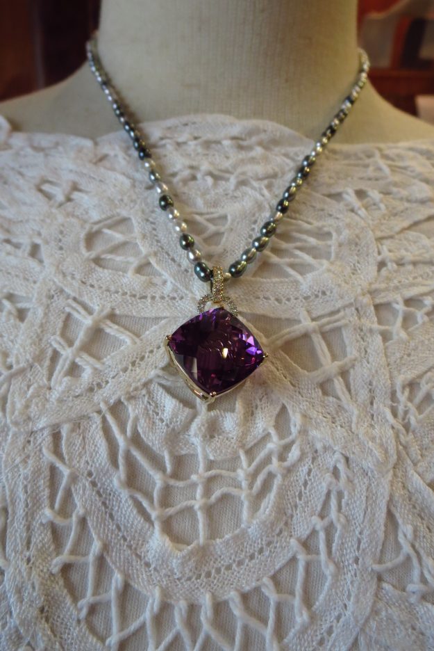 石の持つ紫の神々しさをカット職人の技量で光の魅力をかもし出します。石の研磨からオーダーいただきましたペンダントの完成ですが、すばらしい仕上がりでホットする瞬間です。