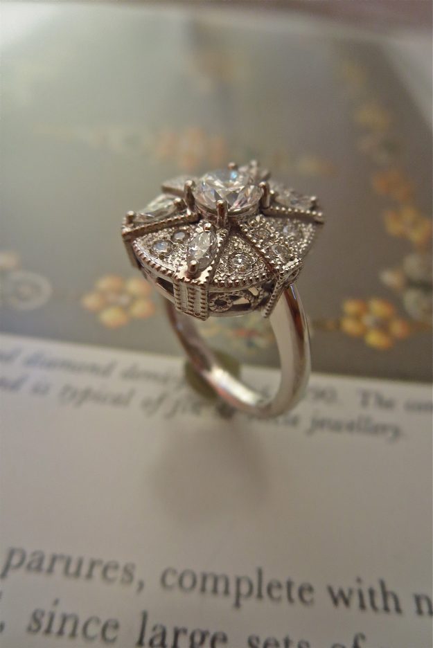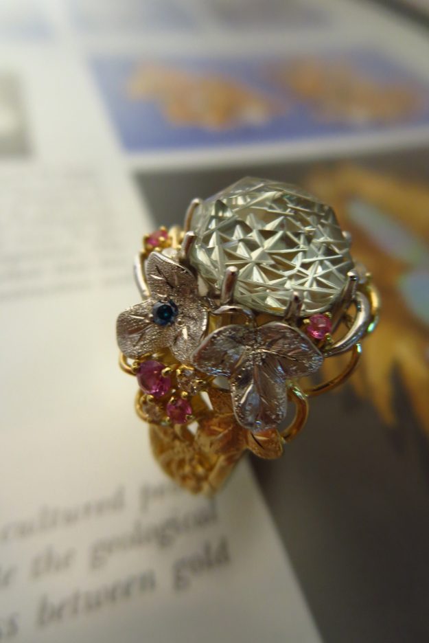 グリーンクオーツ11m/m×9m/mの切子細工とカットされたルースで葡萄のリングです。ヴィジェ定番デザインに新しい風がふきます。