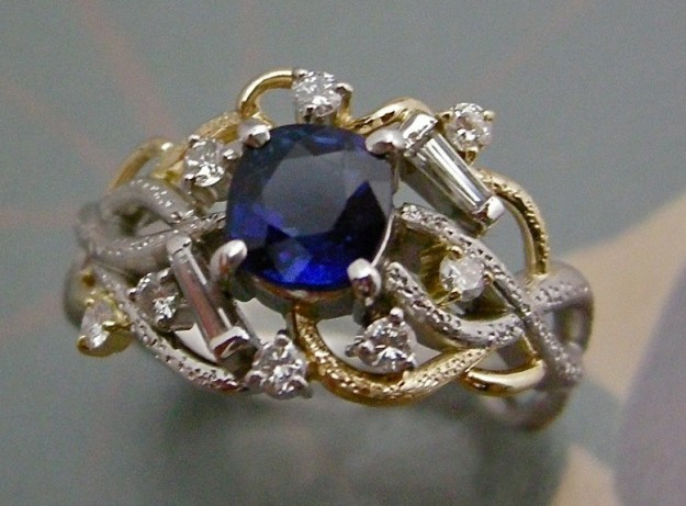 リフォーム。サファイヤのリング。爽やかでリズミカルにはお客様のご要望。古枠に使用していたテーパーダイヤも全て使用して、手づくりリングです。デザイン制作aco