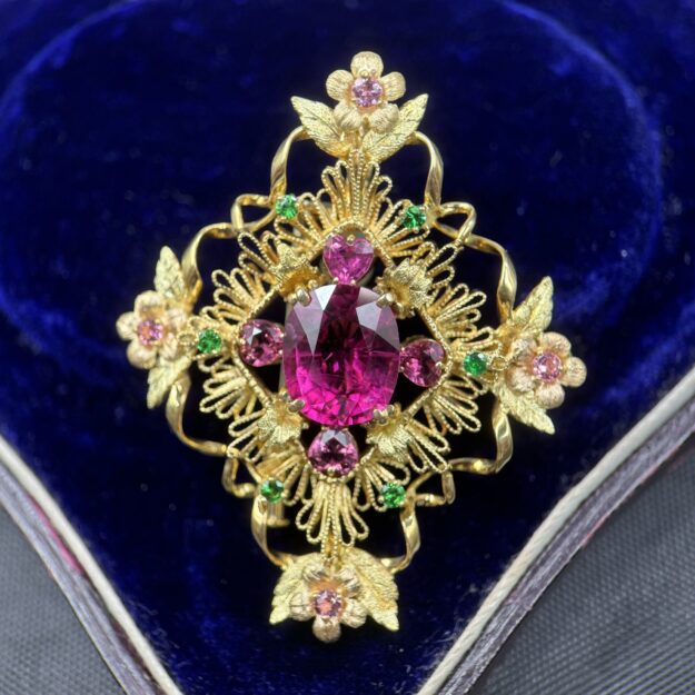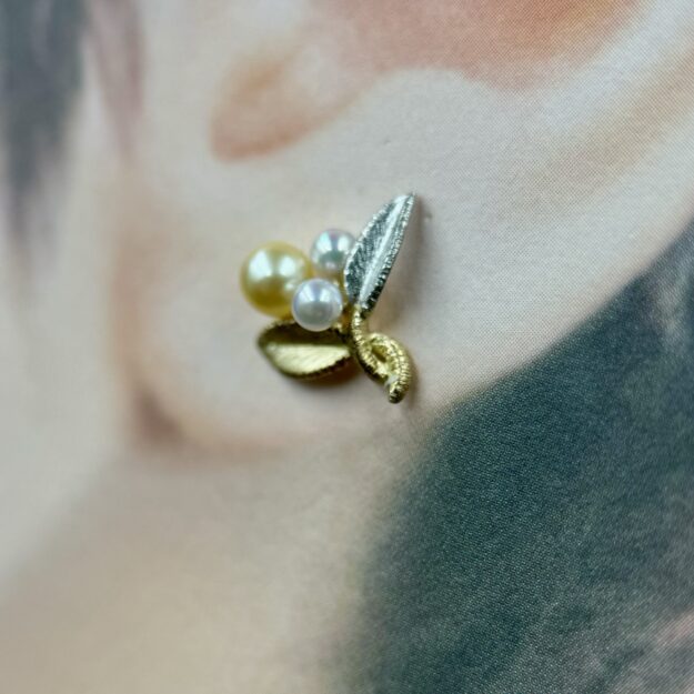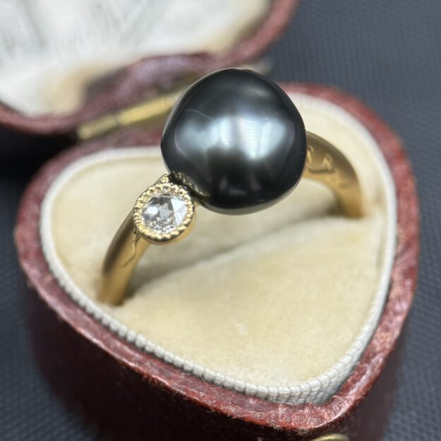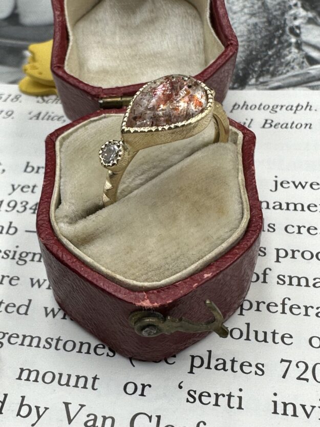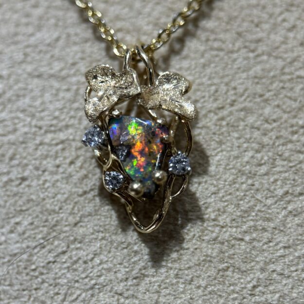 k18ボルダーオパール 0.78ct メレーダイヤ3ピース 葡萄の葉は手彫りのテクスチャー。はの陰影が光線に当たって抑揚感が出ています。オパールは赤味が強い稀少、赤味は