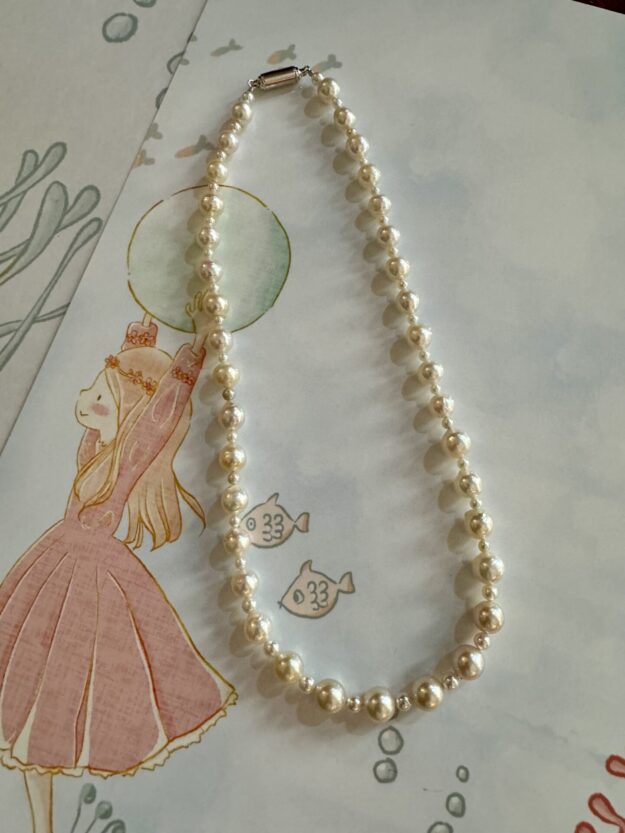 カジュアルなアコヤ真珠ネックレス。大きい珠 7^8mm 小さい珠サイズ 3mm全長42mmチョーカーサイズ、フォーマルにもカジュアルにも使えます。使い終わった後に柔らかい布いてしまえば、日常使いok