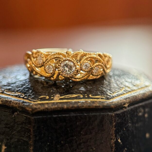 アーム下部は手彫りの線彫り。指馴染みは透かしがら。リズム感のあるリングになっています。