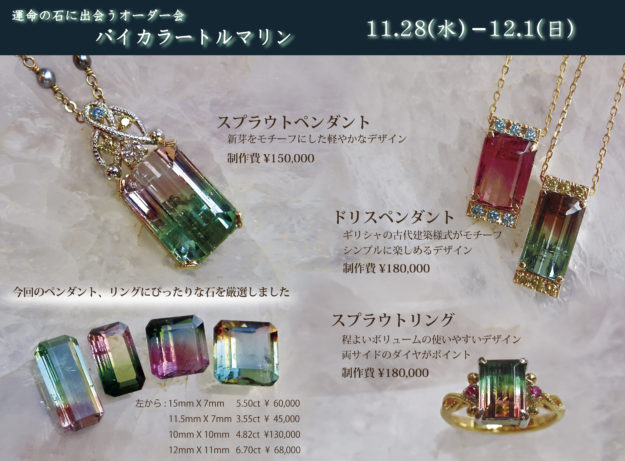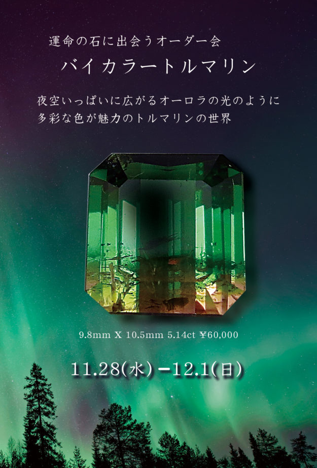 続きを読むオーダー会 11.28(水)〜12.1(日) 夜空いっぱいに広がるオーロラの光のように、多彩な色が魅力のトルマリンの世界。期間中は予約の必要は有りません。ご都合の良いお時間にお出かけ下さい。
