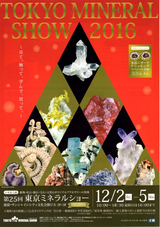 池袋サンシャイン文化会館3階L テーブルNO.397初めての出展で今年2月から京都等数ヶ所に出展してきましたが、第25回東京ミネラルショーでおしまい。12/1~5お店はお休みします。