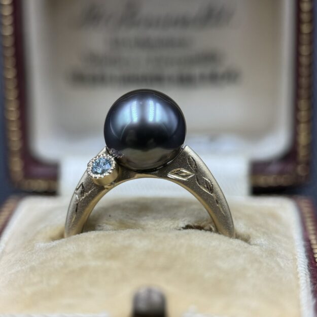 10月12024 オーダーリング 黒真珠にブルーダイヤの合わせでリングを制作。いつもよりダイヤ位置をお客様のご希望で低く設定、指につけた感じは前方よりの見晴らしは最高 写真はライティングしたものと自然光だけで撮影ツーパターン 続きを読む