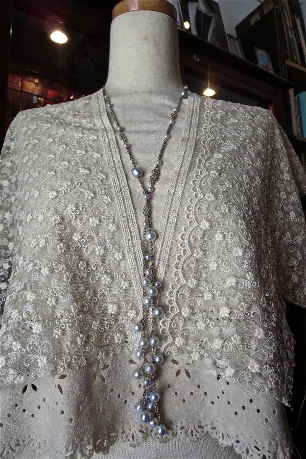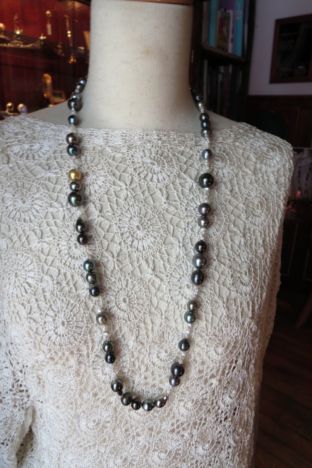 続きを読む22日からのセールに先駆けて、一緒に用意していた、ネックレス用の黒真珠を使い、顧客様の提案でお手持ちのネックレスを合わせて連組しました。もちろんセール当日には予定通り黒真珠とアコヤのケシ珠を使用しました80c/mのロングネックレスも展示しています。もちろんお約束の30%offでのご案内です。