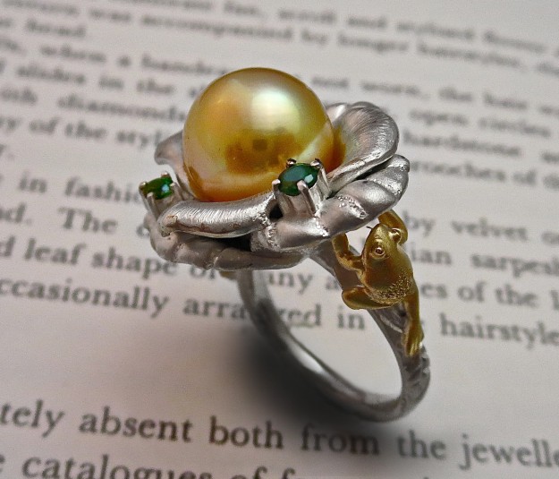 続きを読む神戸国際宝飾展出品作品。ジュエリー作家minaデザイン制作 バラとカエルのリング。ゴールドの南洋球11.5m/mにグリーンガーネットを4ピース使用。詳細は本文をご覧いただき、店頭でもご覧いただけます。