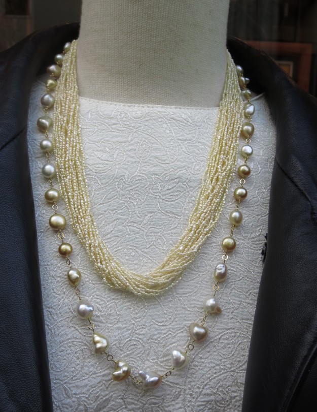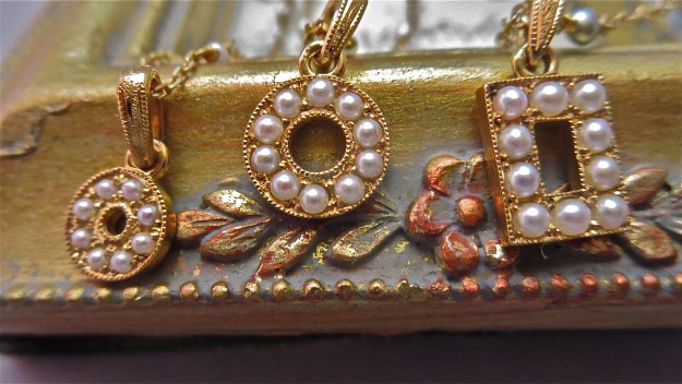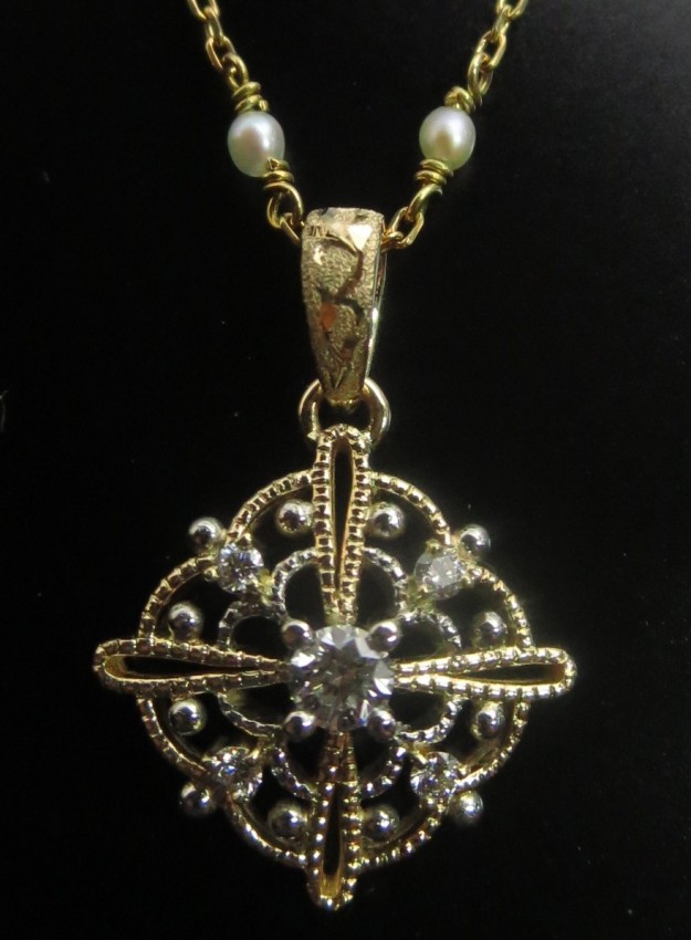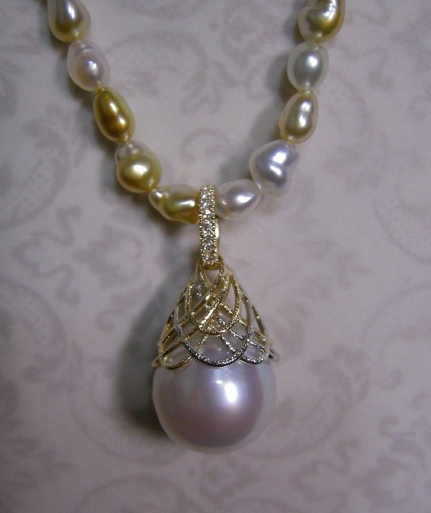 南洋球を使用した格子のペンダント、プラチナとゴールドでラインにタガネ。acoのオーダージュエリーです。