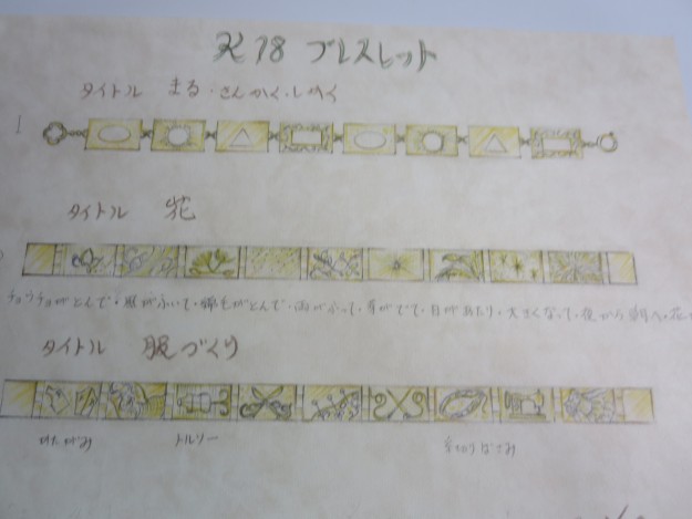 陽の目を見ていない、アーチスト希望のデザイン画です。○△□、花、服づくり、服飾からジュエリーのアーチストを目指した、女性の15〜6年前に描いたものでファイルから1枚選びました。