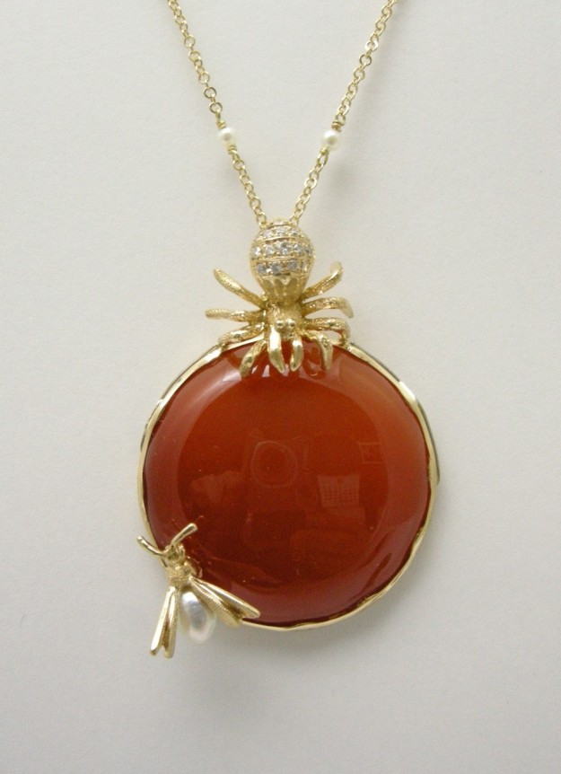 k18珊瑚ペンダント、帯留めを大振りなペンダントにリフォーム、長めのチェーンに下げて縦のラインを強調して着こなしがスッキリした印象に!モチーフはハチとクモ、昆虫のストーリーから。。。。