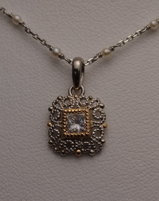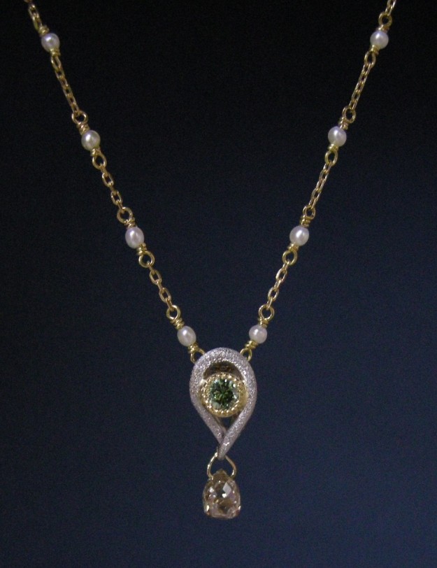 PTK18カラーダイヤ ペンダント グリーンダイヤ 0,117キャラットをK18で取り巻きアウトラインはPTで。