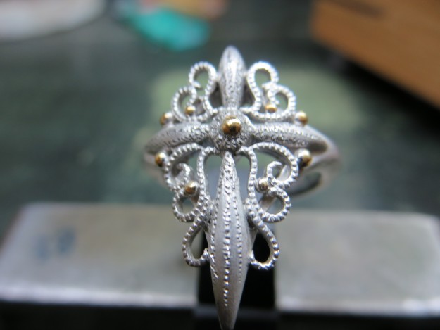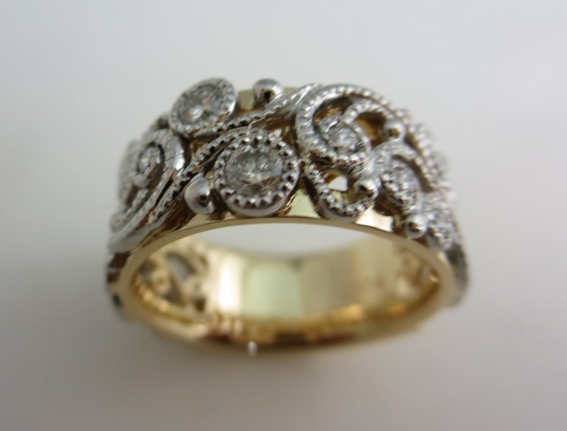 1月19日に仮合わせをしました作品の完成です。ダイヤの彫留め、プラチナラインのミル打ち。早速身に付けられたと同時に写真に納めさせていただいて、お客様も身に付けられたままお帰りでした。
