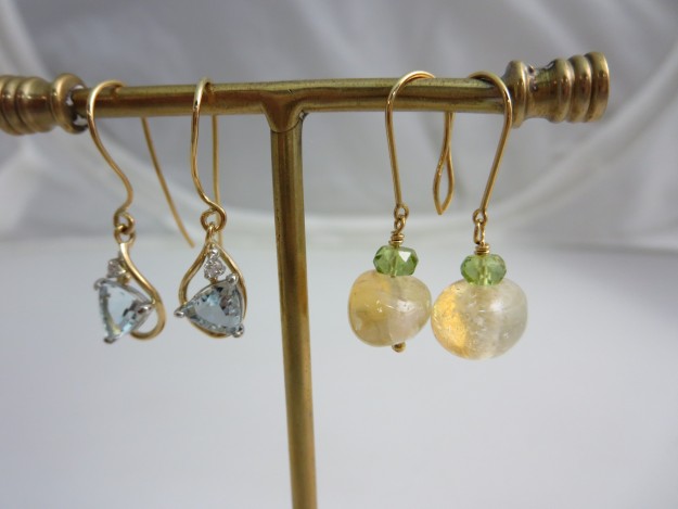 写真右はk18使用でシトリンのカボッションカットが可愛くて印象的です。ペリドットのビーズを頭にいただいて、チャーミングなピアスです。